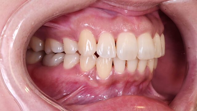 下の奥歯にリンガルボタン装着。ゴムの力で上前歯を引くため、顎間ゴムの終日着用をお願いしました。