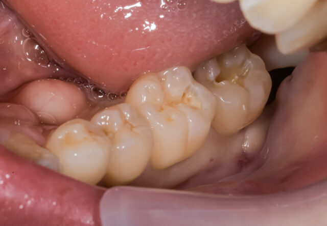 左下の奥歯、咬合面(噛み合わせの面)に小さな虫歯が確認出来ます。